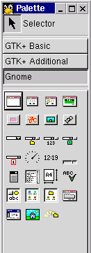 Glade'i başlattıktan sonra iki pencereniz olacaktır. Birisi Palette adındaki hünerli alet kutusudur. Bu pencerede GTK+ Basic, GTK+ Additional ve Gnome içinden aletin türlerini seçebilirsiniz. Eğer Gnome aletiniz yoksa Glade, Gnome desteği olmadan derlenebilir. Kaynak Glade paketinin configure(yapılanması)'unu kontrol edin. configure --help konfigürasyon seçeneklerini açıklar.